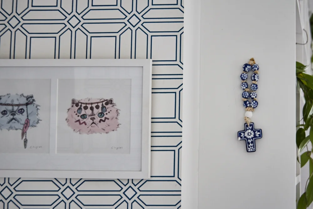 It has a Mexican influence with an eclectic mix of pastels and bold colour and religious artefacts.