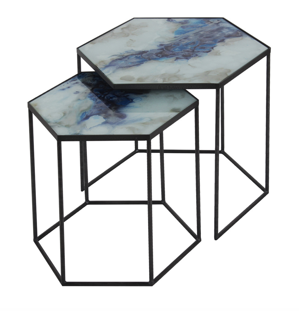 Kartell Upper Step Ladder, $554. Notre Monde Hexagonal Nesting side table, $1382. Burleigh Blue Calico plate, $49. Mulberi Adore cushion, $185.