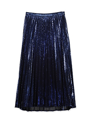 Country Road Pleat Sequin skirt, $259. Karen Walker Oceanus Mosaic Scarf, $95. Deadly Ponies Mr Boxette, $549. Balenciaga Triple S trainers, $1170.