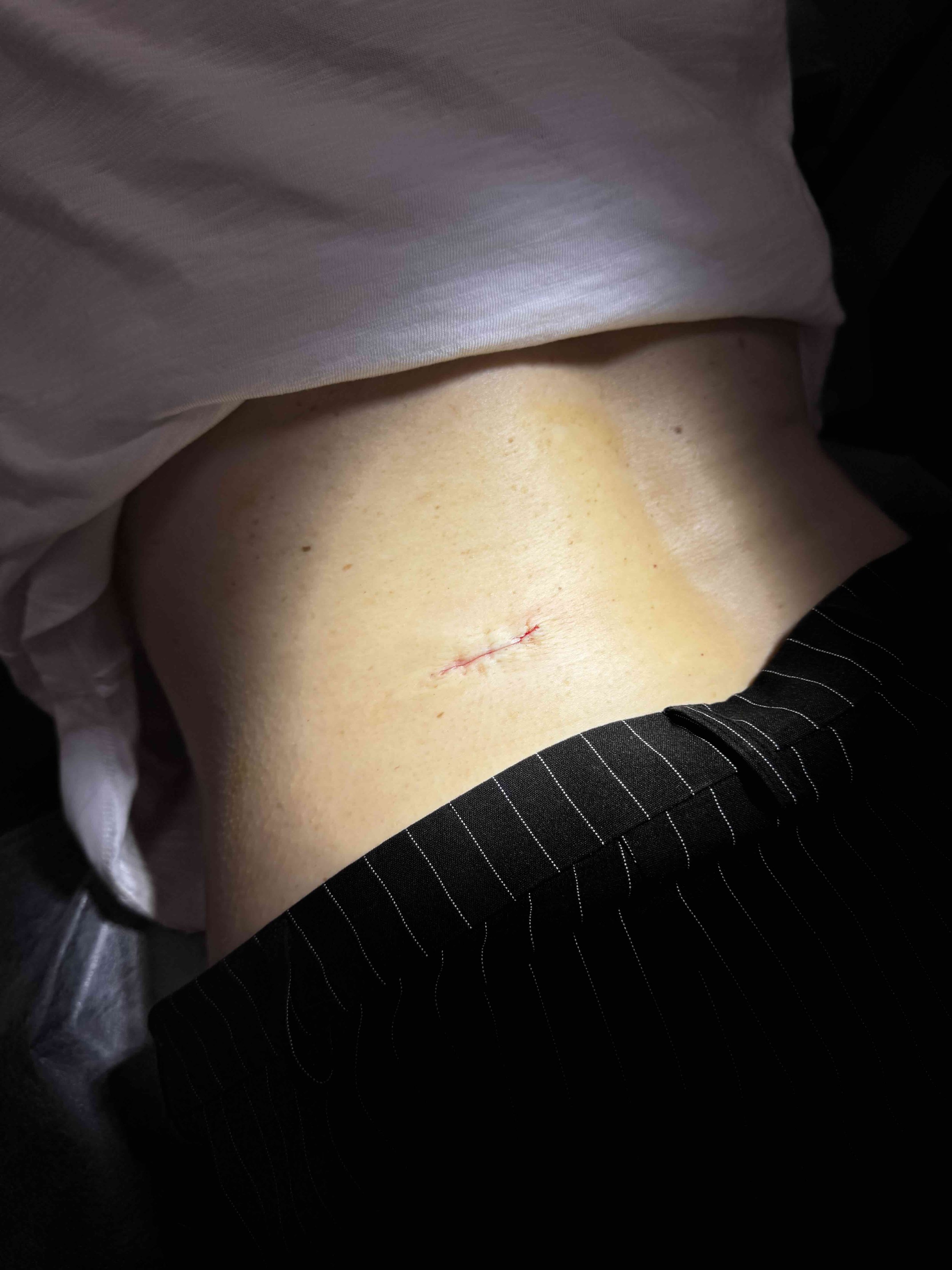 I’m following the best scar practice, and now that the wound has healed, I’ll tape the scar for six months, reapplying every few days. Keeping the tape on 24/7 keeps constant pressure on the scar and helps flatten it. Then, in six months, I’ll use scar gel and massage.