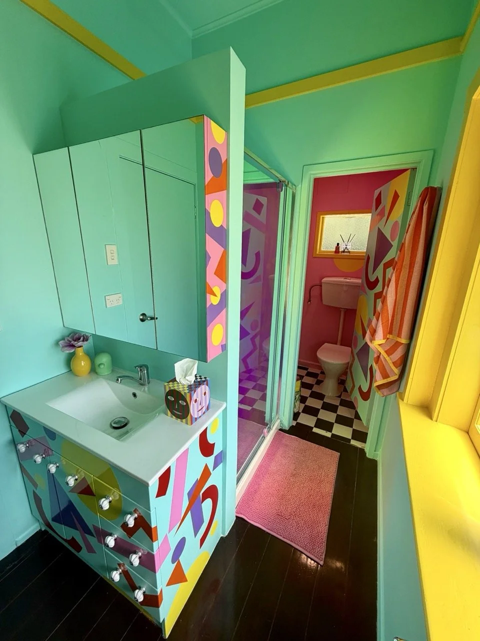 The transformation is unapologetic. Minty greens, punchy yellows, candy pinks and bold graphic detailing collide in the best possible way. The vanity becomes a statement piece rather than background furniture, wrapped in colour and pattern that instantly draws the eye.