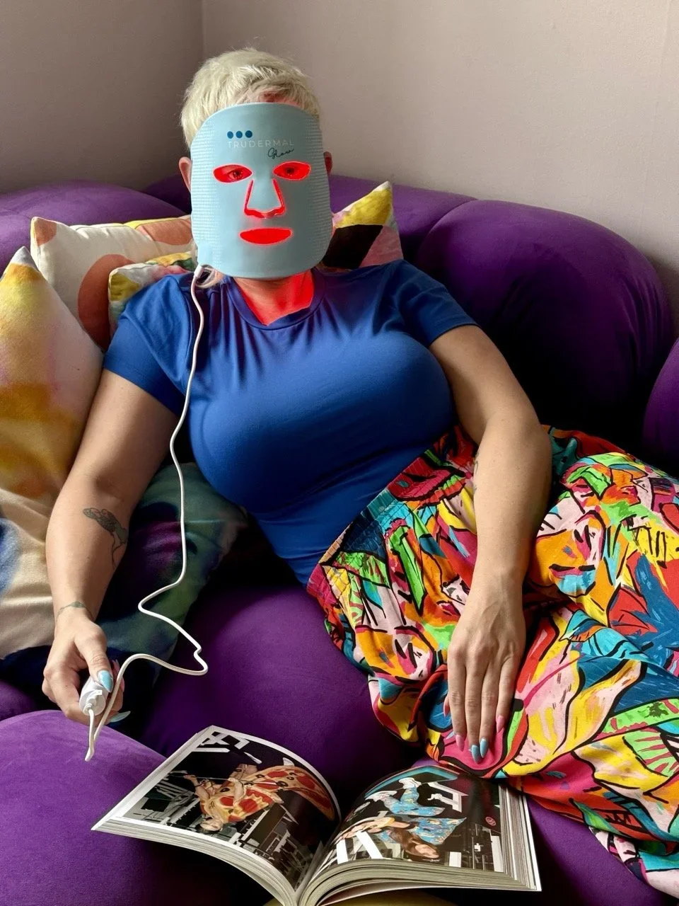 Style director Louise Hilsz wearing her Trudermal Glow LED face mask