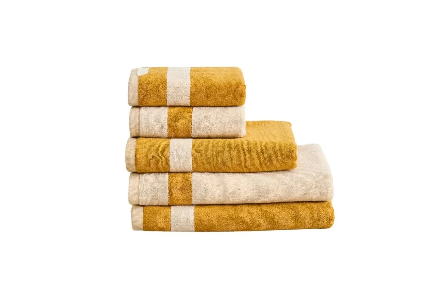 Bed Threads crème & turmeric two-toned bath towel bundle, $320. Resene Buttercup paint available from Resene Colour Shops. Mico Clearlite Luna wall-hung vanity, $1590. Frankie basin sink in matte white, $533 from ABI Interiors.