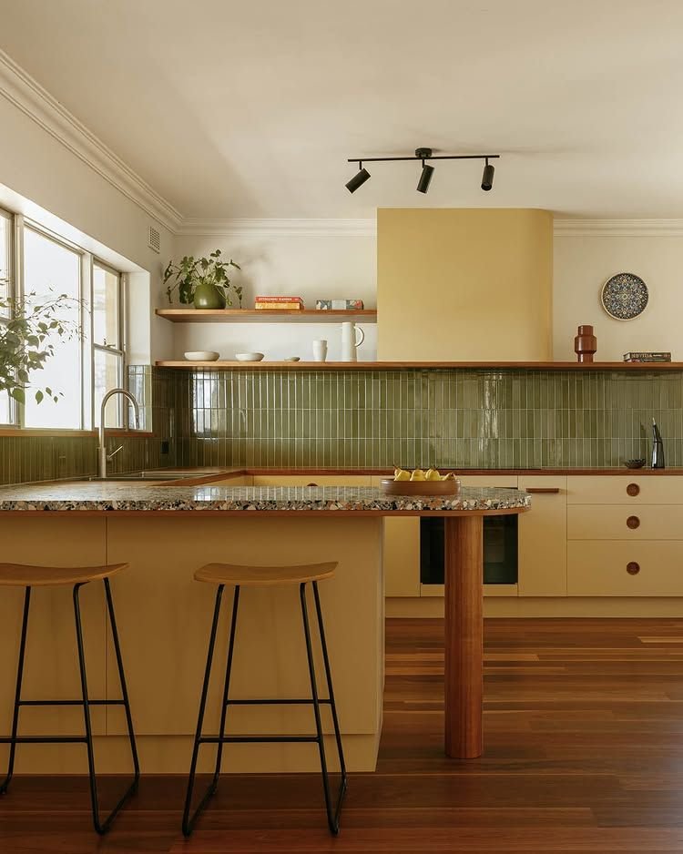 For a subtle nod to this buttery shade, use yellow as an accent colour. Add yellow bar stools, a kettle, or even a backsplash with small yellow tiles. This adds brightness without locking you into a big commitment. It’s especially effective in modern kitchens with predominantly white or grey cabinetry. Consider a yellow kitchen island as a focal point, a pantry door or open shelving painted in a warm yellow. If you want yellow to age well, choose mustard or ochre; these shades add warm, earthy tones and bring a vintage vibe. Buttery yellow is a country-style classic, while bright lemon is fresh and modern.